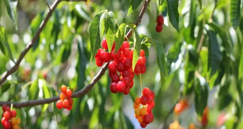 - Frutos: Drupas globosas rojas (comestibles para aves).