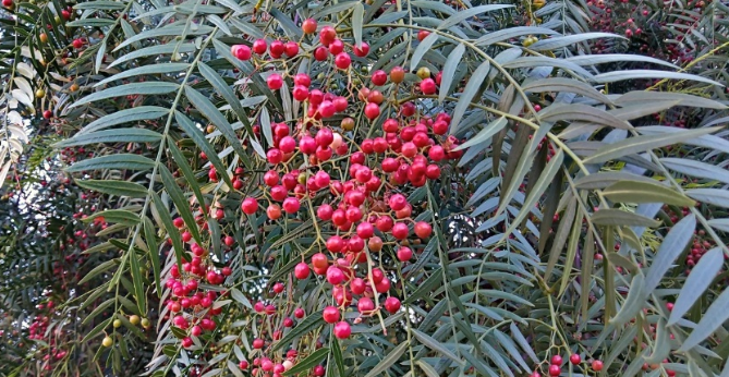 - Frutos: Drupas rosadas (pimienta rosa).